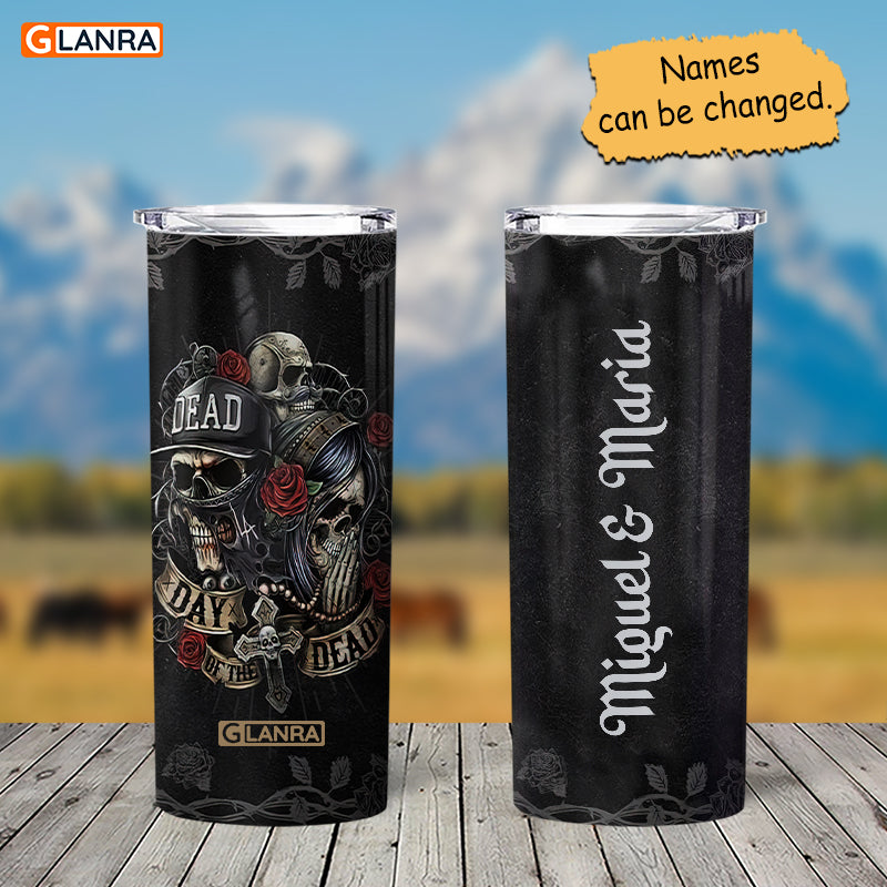 Personalized Day Of The Dead Skinny Tumbler, Custom Skull Couple Skinny Tumbler, Stainless Steel, Water Bottle, Glitter, Metal, Insulated, Tumbler
