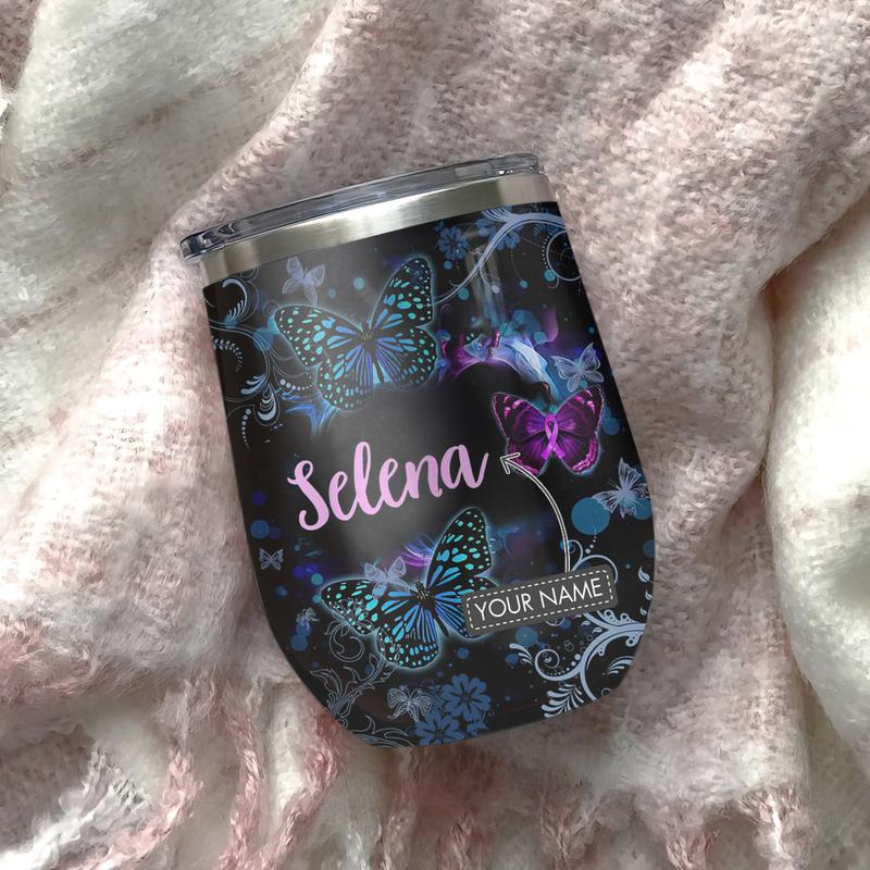 Personalized Faith Hope Love Fibromyalgia Awareness Wine Tumbler, Custom Butterfly Wine Tumbler
