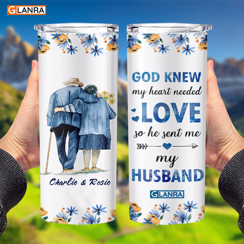 Personalized God Knew My Heart Needed Love Skinny Tumbler, Custom Old Couple Tumbler, Stainless Steel, Water Bottle, Glitter, Metal, Insulated