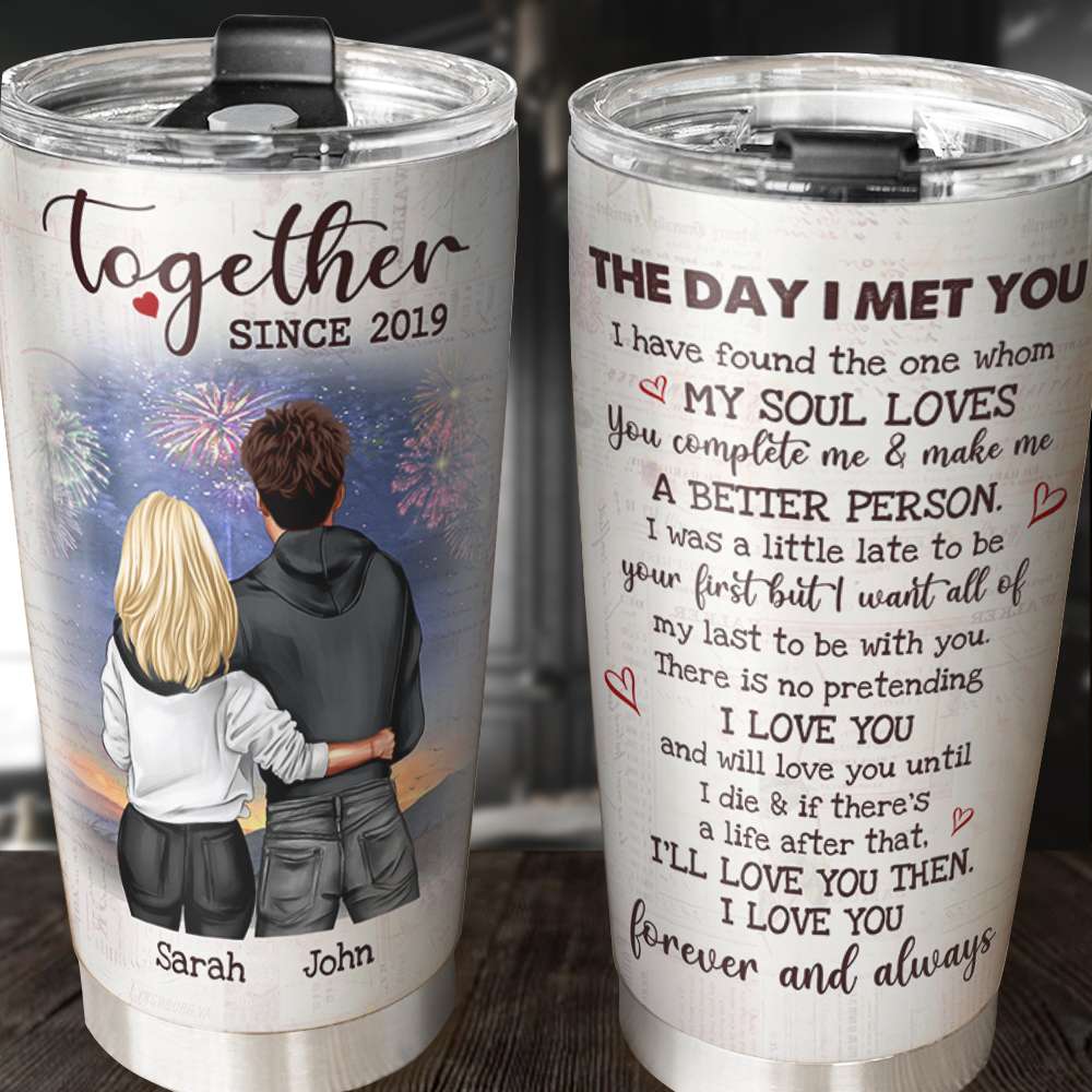 So whether you're looking to show off your own name or create a personalized gift for someone special, LateAndLow Store has got you covered. Start designing your own custom Personalized Hoodie Couple Tumbler Cup – Together Since The Day I Met You print-on-demand product today, and let us bring your vision to life!