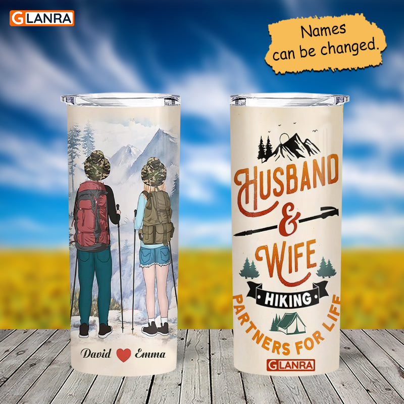 Personalized Husband & Wife Hiking Partners For Life Skinny Tumbler, Custom Couple Stainless Steel, Water Bottle, Glitter, Metal, Insulated, Tumbler