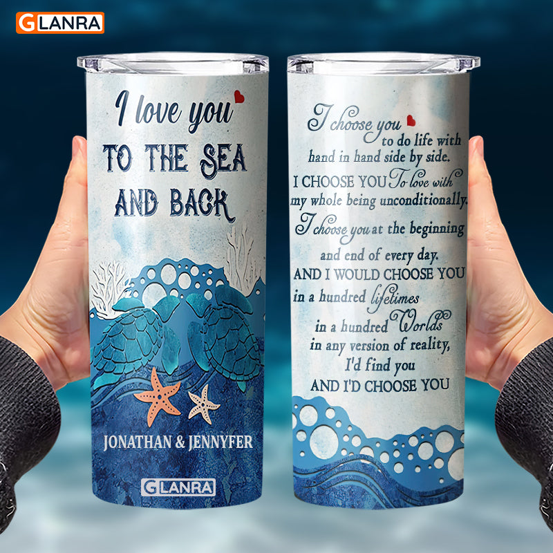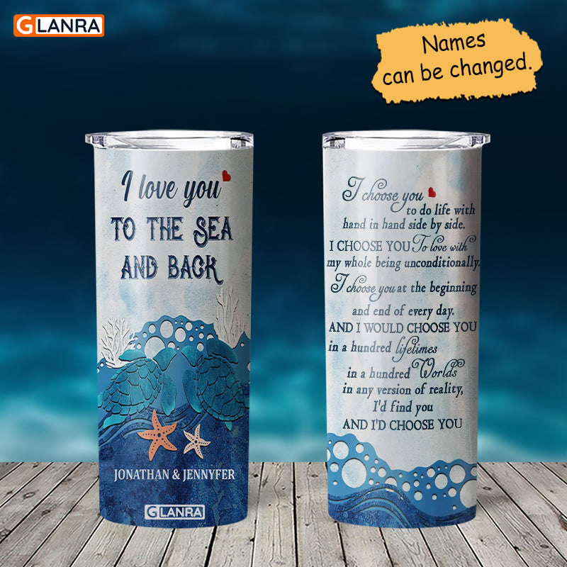 Personalized I Love You To The Sea And Back Skinny Tumbler, Custom Sea Turtle Couple Stainless Steel, Water Bottle, Glitter, Metal, Insulated, Tumbler