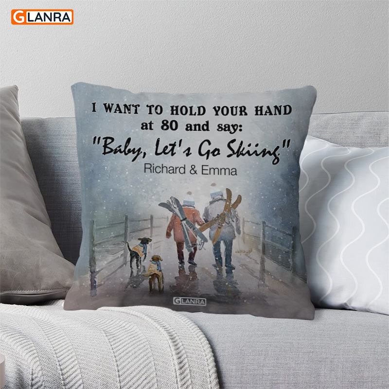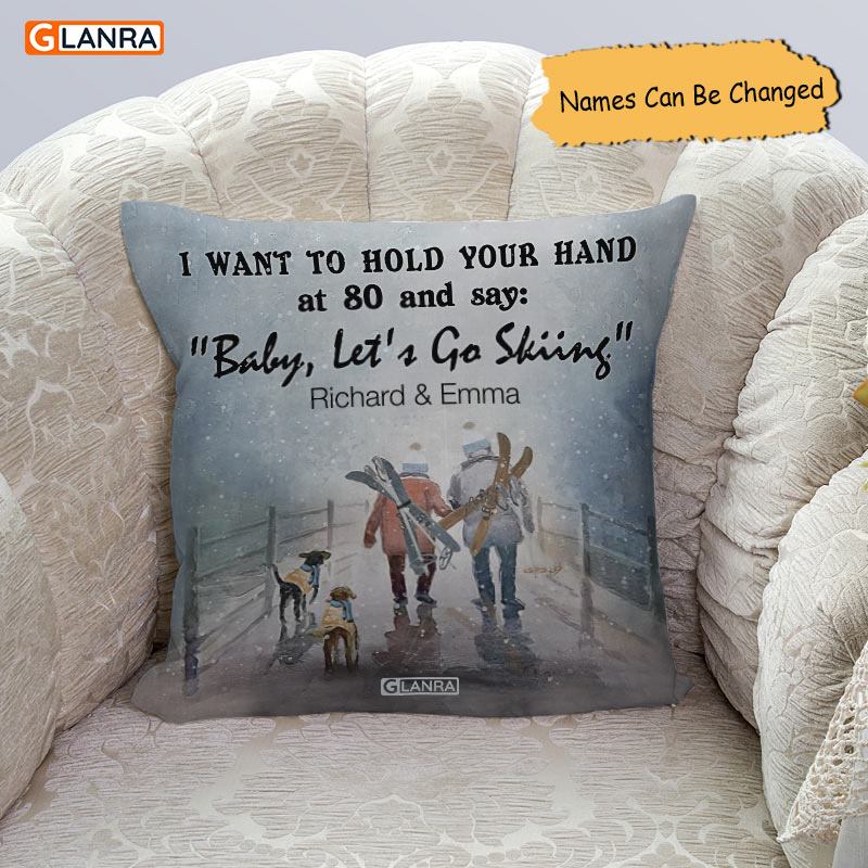 Personalized I Want To Hold Your Hand At 80 And Say Baby Let’S Go Skiing Pillow, Custom Skiing Couple Pillow, Couple Pillow (Insert Included)