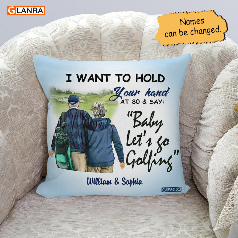 Personalized I Want To Hold Your Hand At 80 & Say Baby Let’S Go Golfing Pillow, Custom Golfing Couple Pillow, Husband Wife Pillow (Insert Included)