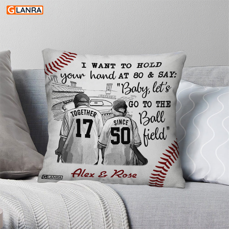 Personalized I Want To Hold Your Hand At 80 & Say Baby Let’S Go To The Ball Field Pillow, Custom Baseball Couple Pillow (Insert Included)