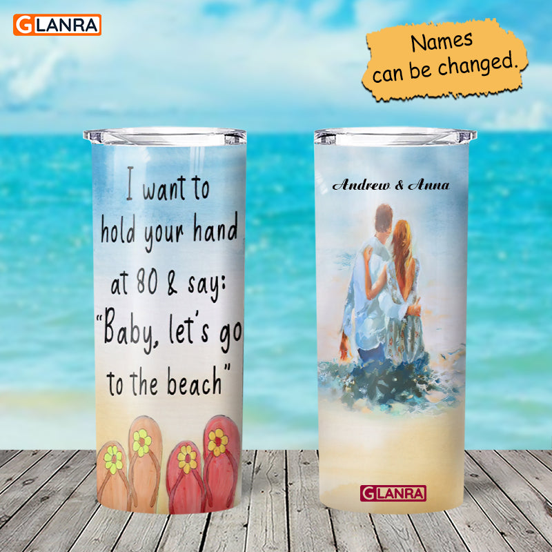 Personalized I Want To Hold Your Hand At 80 Skinny Tumbler, Custom Beach Couple Glitter Water Bottle, Stainless Steel Tumbler, Metal, Insulated