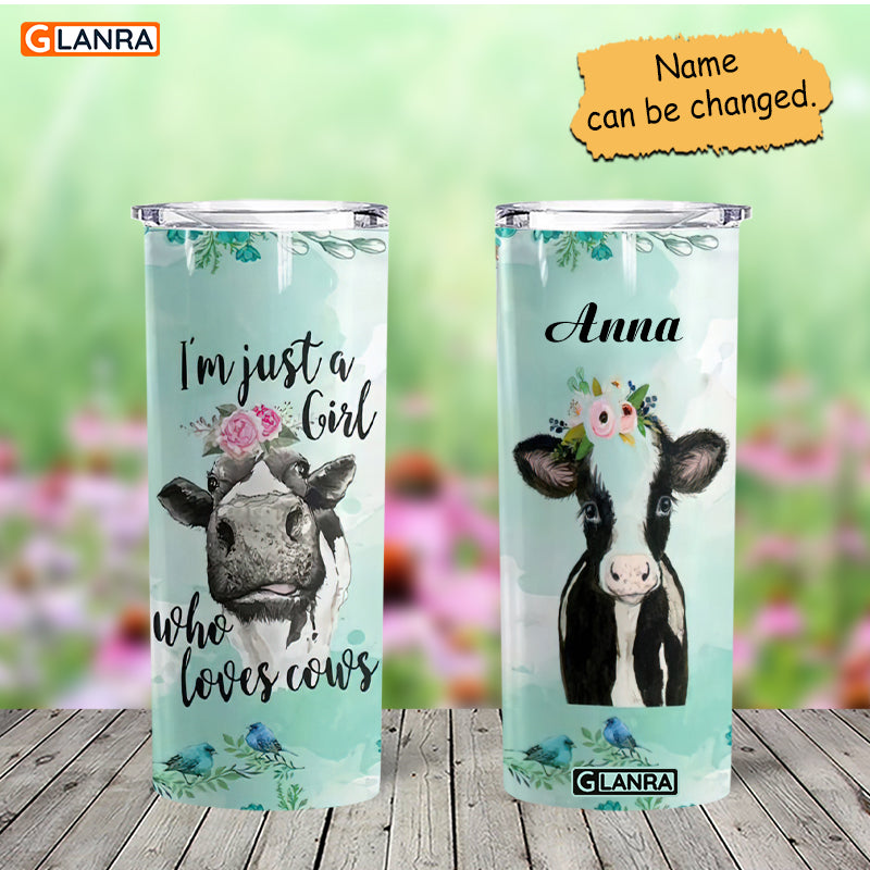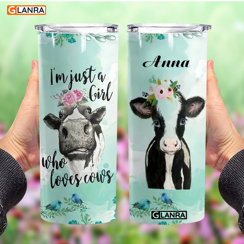 Personalized I’M Just A Girl Who Loves Cows Skinny Tumbler, Custom Cow Skinny Tumbler, Stainless Steel Tumbler, Glitter Water Bottle, Metal, Insulated