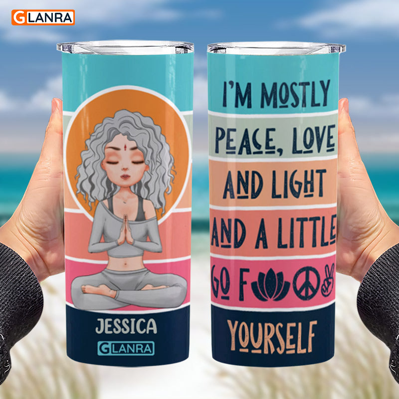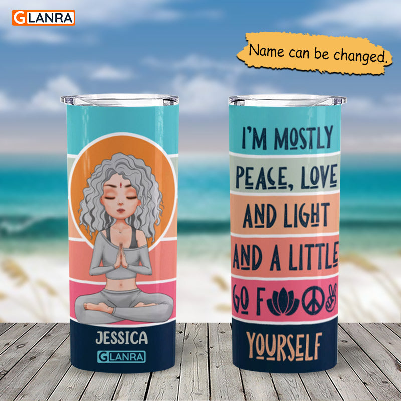 Personalized I’M Mostly Peace Love And Light Skinny Tumbler, Custom Girl Meditation Water Bottle, Stainless Steel, Metal, Insulated, Glitter, Tumbler