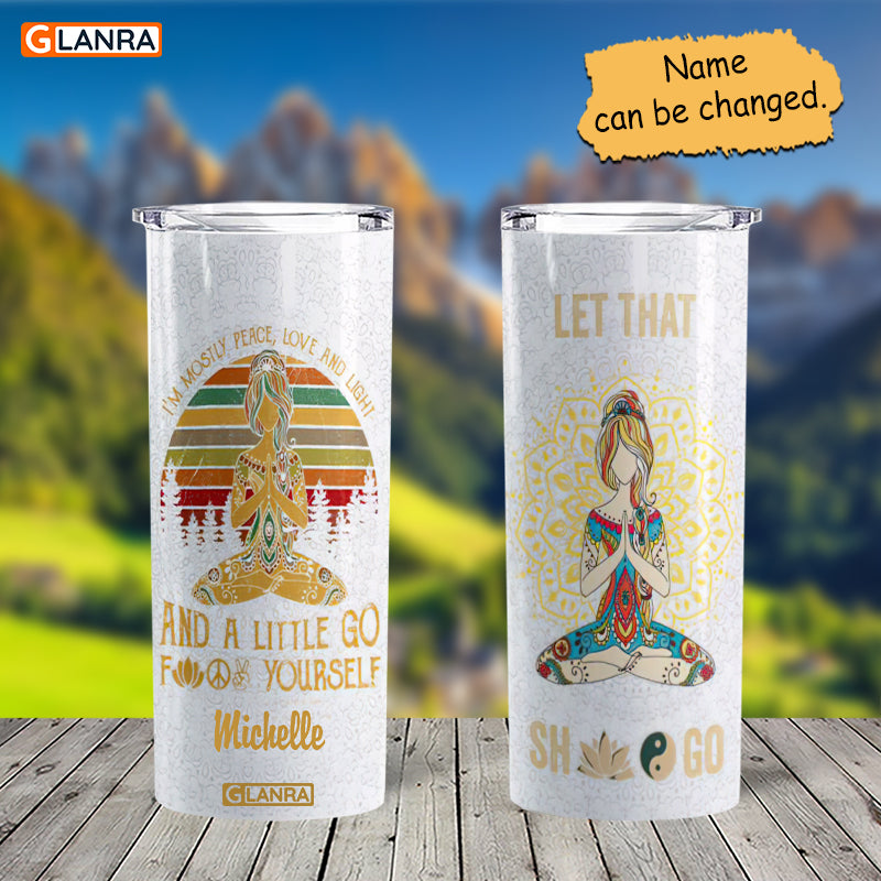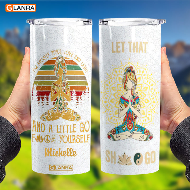 Personalized I’M Mostly Peace Love And Light Skinny Tumbler, Custom Yoga Meditation Stainless Steel, Water Bottle, Glitter, Metal, Insulated, Tumbler