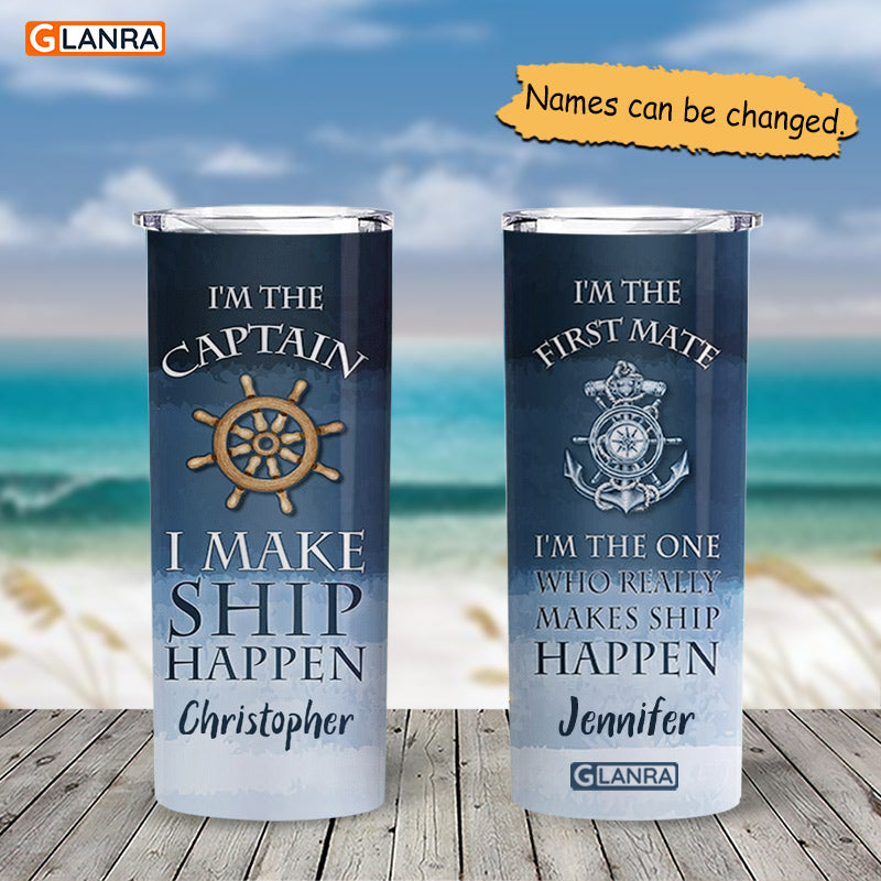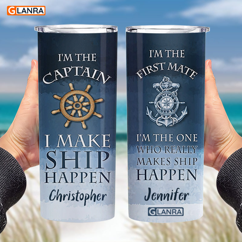 Personalized I’M The Captain I’M The First Mate Skinny Tumbler, Custom Couple Stainless Steel, Water Bottle, Glitter, Metal, Insulated, Tumbler