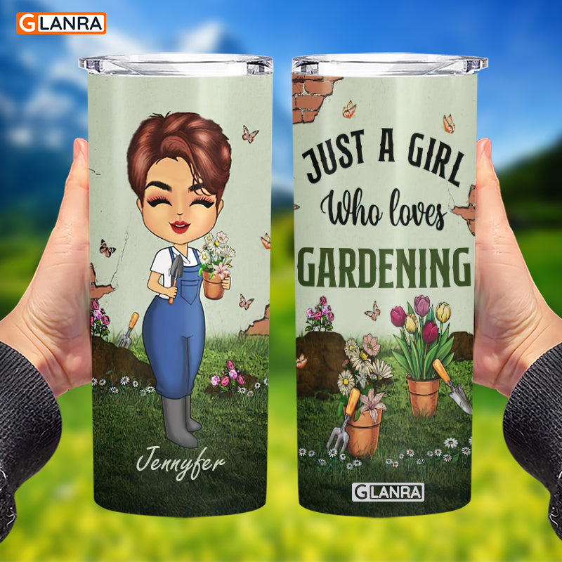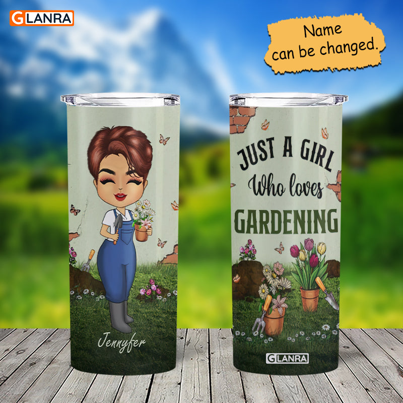 Personalized Just A Girl Who Loves Gardening Skinny Tumbler, Custom Gardening Stainless Steel, Water Bottle, Glitter, Metal, Insulated, Tumbler