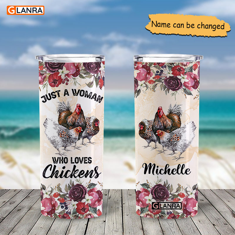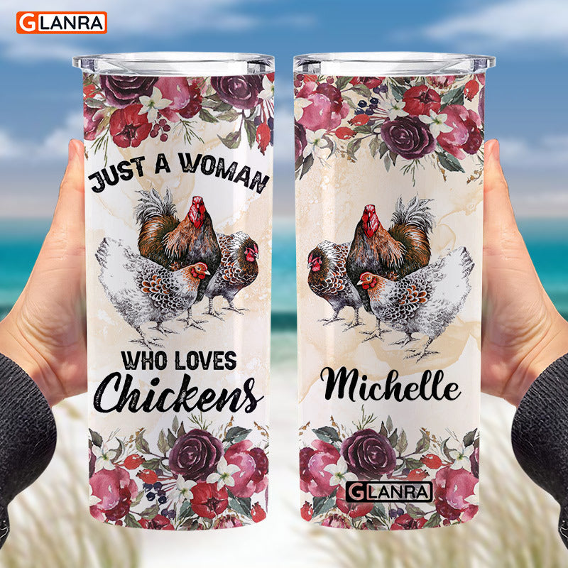 Personalized Just A Woman Who Loves Chickens Skinny Tumbler, Custom Chicken Tumbler, Stainless Steel, Water Bottle, Glitter, Metal, Insulated, Tumbler