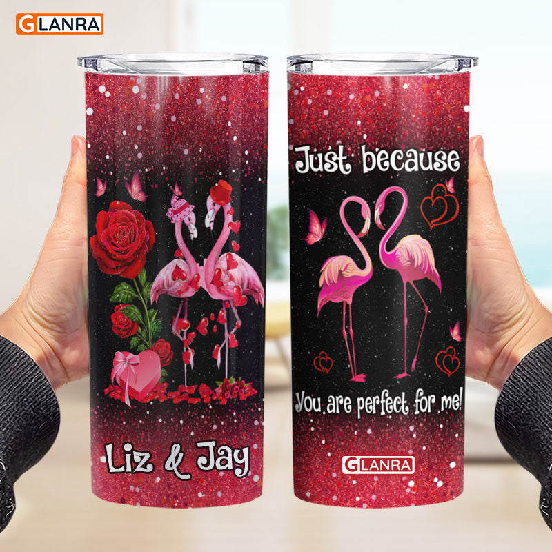Personalized Just Because You Are Perfect Skinny Tumbler, Custom Flamingo Couple Glitter Water Bottle, Stainless Steel Tumbler, Metal, Insulated
