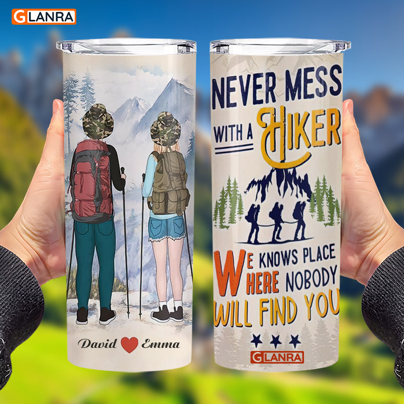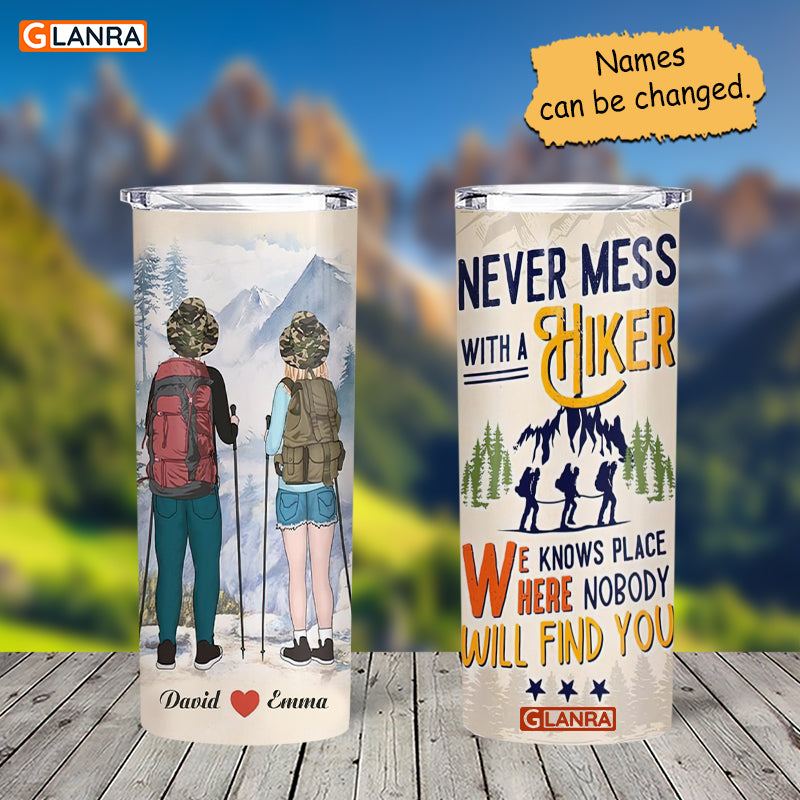 Personalized Never Mess With A Hiker Skinny Tumbler, Custom Hiking Couple Tumbler, Stainless Steel, Water Bottle, Glitter, Metal, Insulated, Tumbler