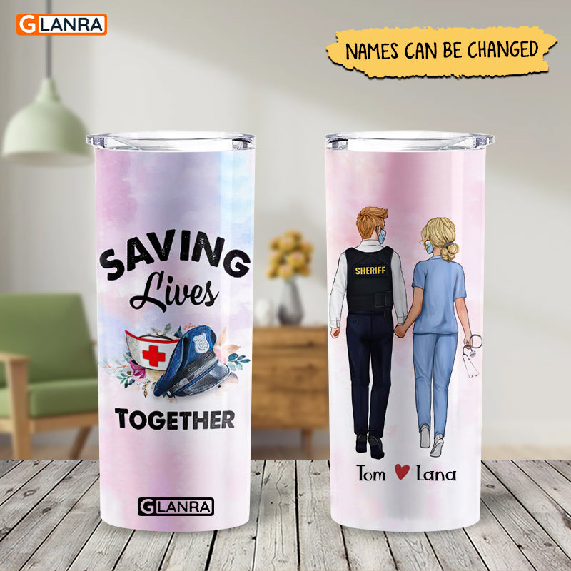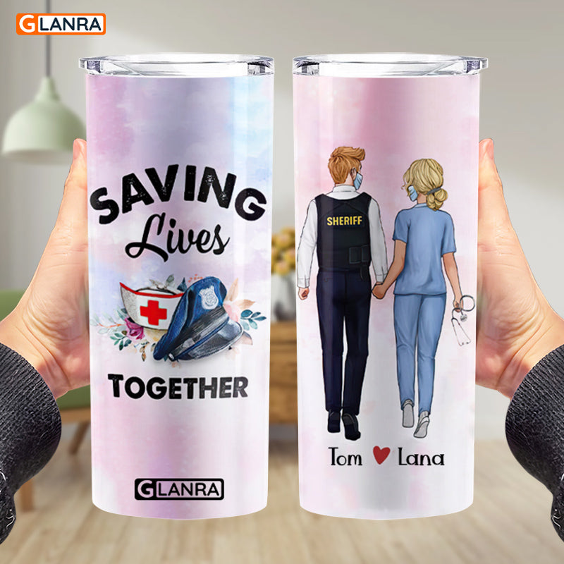 Personalized Saving Lives Together Skinny Tumbler, Custom Nurse Police Couple Stainless Steel, Water Bottle, Glitter, Metal, Insulated, Tumbler