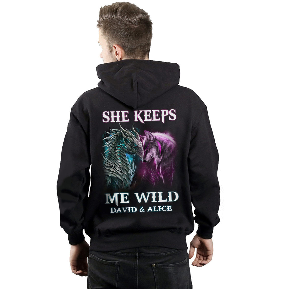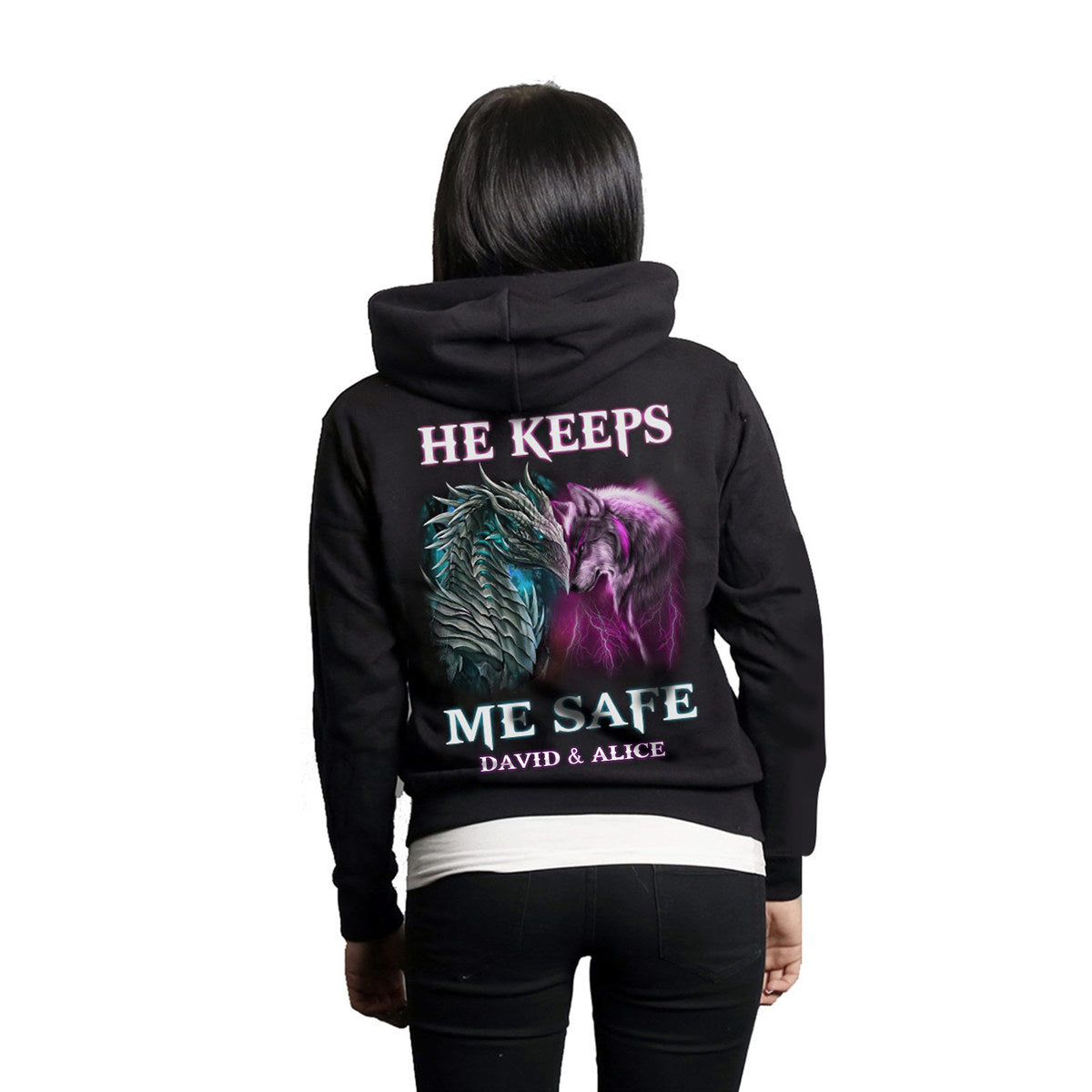 Personalized She Keeps Me Wild He Keeps Me Safe Hoodie, Custom Couple Hoodie, Husband Wife Hoodie, Dragon Hoodie, Wolf Hoodie, Unisex Hoodie