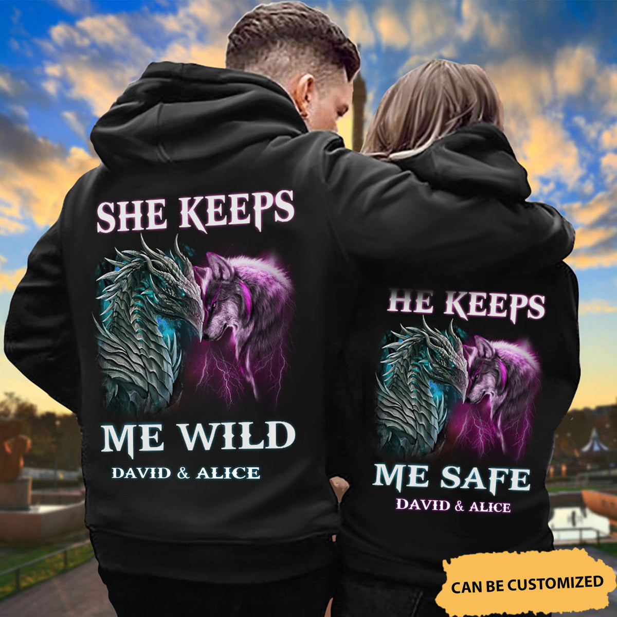 So whether you're looking to show off your own name or create a personalized gift for someone special, LateAndLow Store has got you covered. Start designing your own custom Personalized She Keeps Me Wild He Keeps Me Safe Hoodie, Custom Couple Hoodie, Husband Wife Hoodie, Dragon Hoodie, Wolf Hoodie, Unisex Hoodie print-on-demand product today, and let us bring your vision to life!