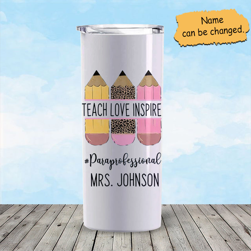 Personalized Teach Love Inspire Skinny Tumbler, Custom Teacher Skinny Tumbler, Stainless Steel, Water Bottle, Glitter, Metal, Insulated, Tumbler