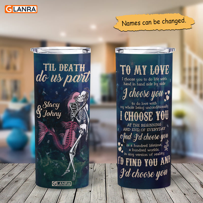 Personalized Til Death Do Us Part Skinny Tumbler, Custom Mermaid Skeleton Couple Stainless Steel, Water Bottle, Glitter, Metal, Insulated, Tumbler