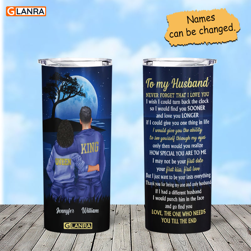 So whether you're looking to show off your own name or create a personalized gift for someone special, LateAndLow Store has got you covered. Start designing your own custom Personalized To My Husband Never Forget That I Love You Skinny Tumbler, Custom Couple Stainless Steel Tumbler, Water Bottle, Glitter, Metal, Insulated print-on-demand product today, and let us bring your vision to life!