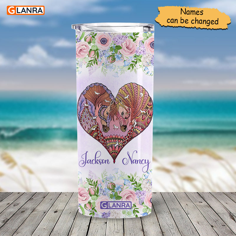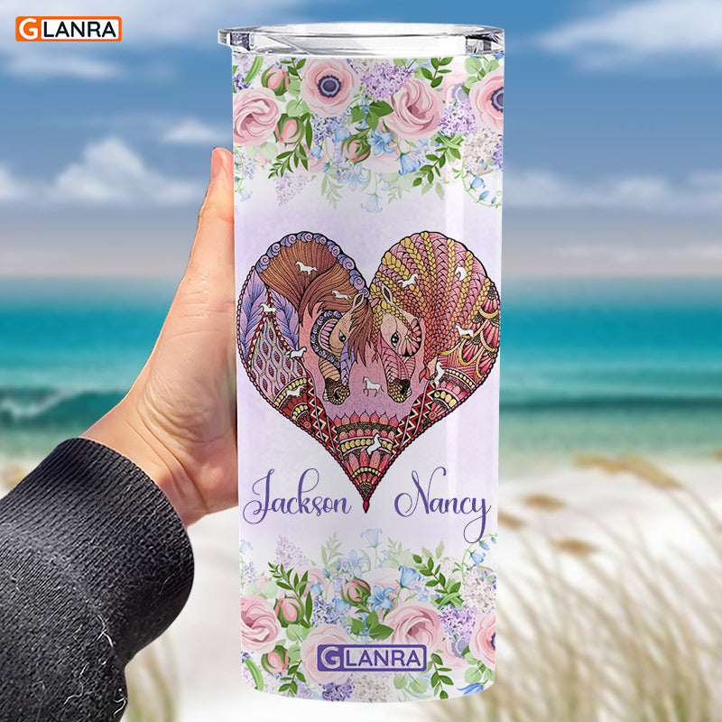 Personalized Valentine Horses Heart Floral Skinny Tumbler, Custom Horse Couple Glitter Water Bottle, Stainless Steel Tumbler, Metal, Insulated
