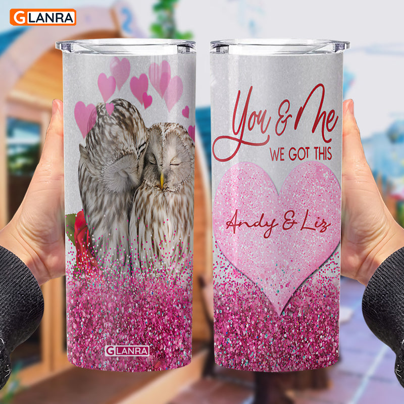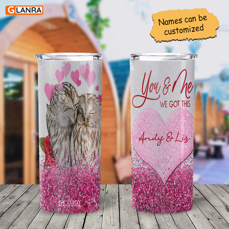 Personalized You & Me We Got This Skinny Tumbler, Custom Owl Couple Tumbler, Valentine Glitter Water Bottle, Stainless Steel Tumbler, Metal, Insulated