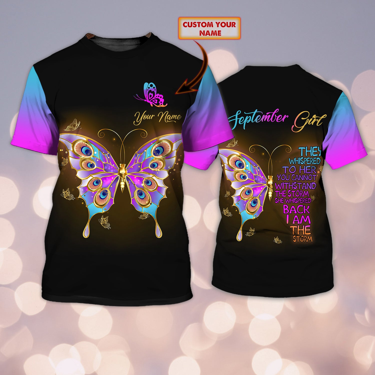 So whether you're looking to show off your own name or create a personalized gift for someone special, LateAndLow Store has got you covered. Start designing your own custom September Girl Love Butterfly – Name 3D Tshirt – Atm2K print-on-demand product today, and let us bring your vision to life!