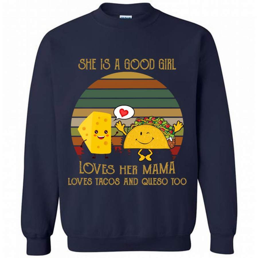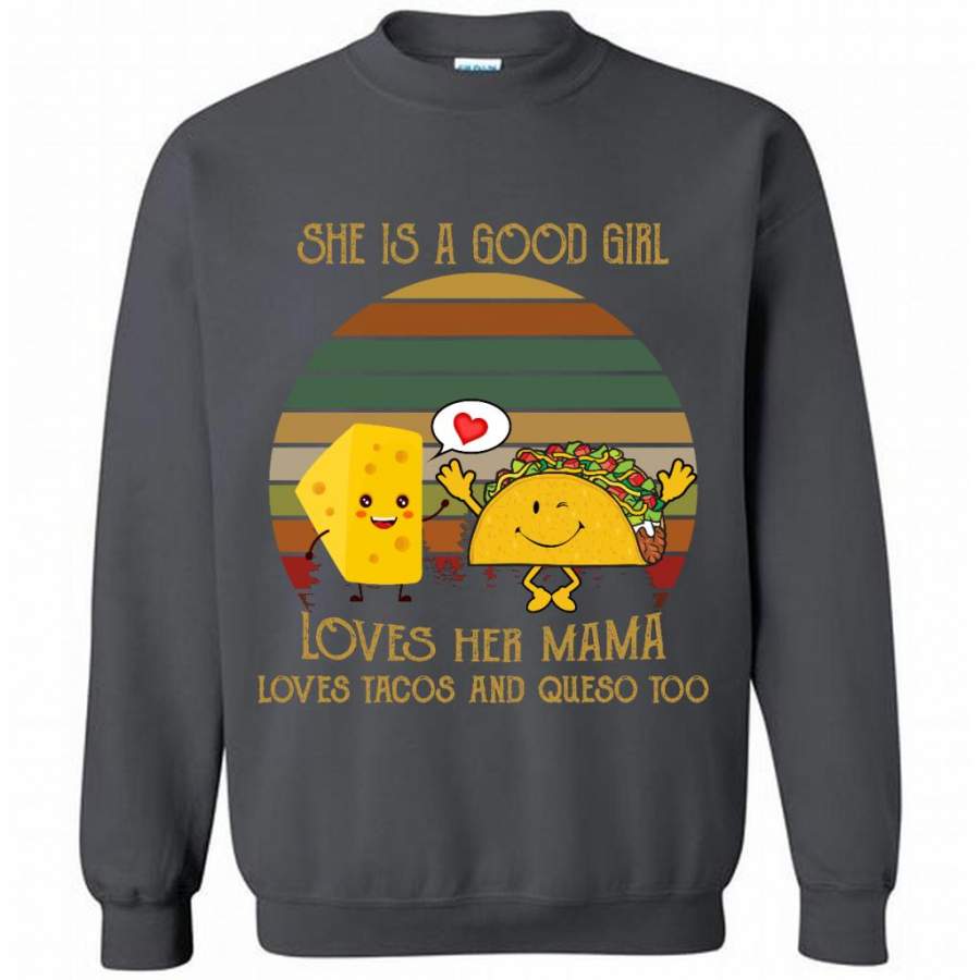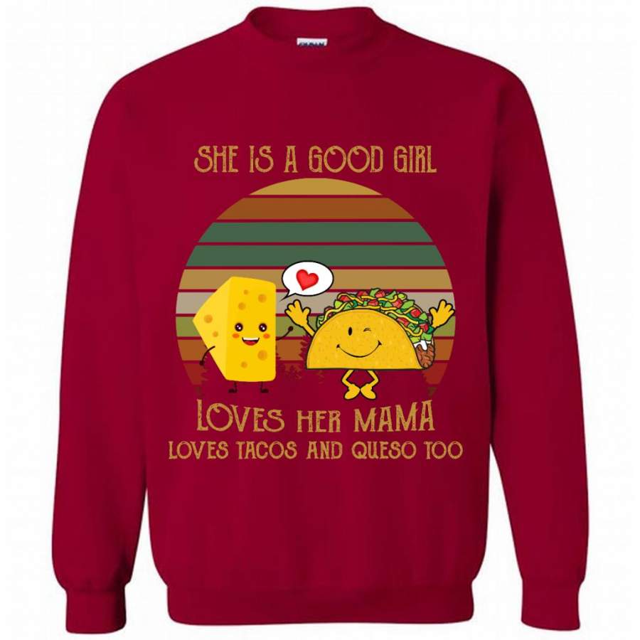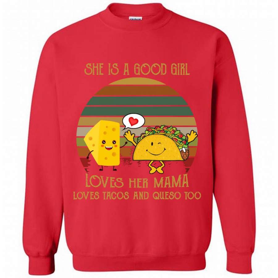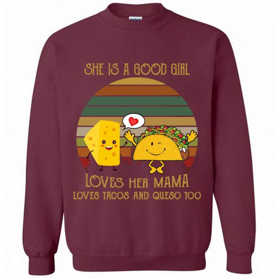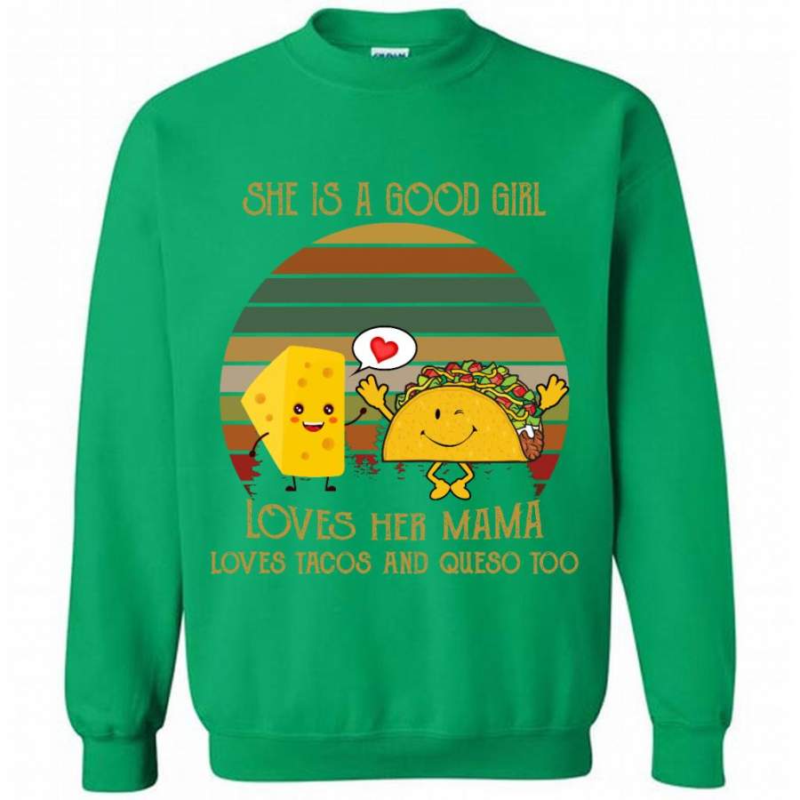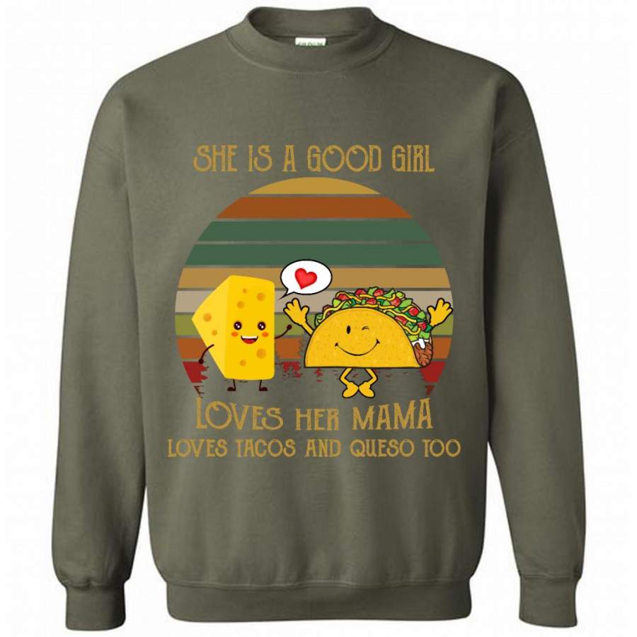 She Is A Good Girl Loves Her Mama Loves Tacos And Queso Too, Classic Vintage Retro – Gildan Crewneck Sweatshirt