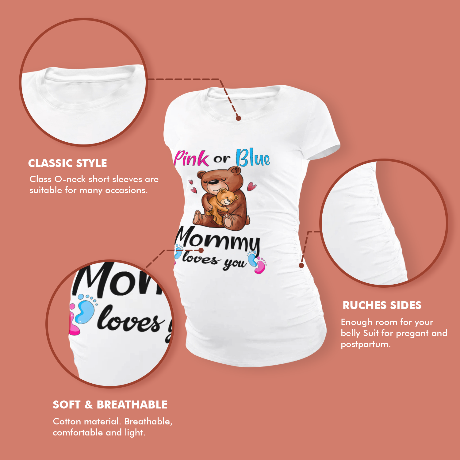 Our print-on-demand products are made with the highest quality materials, ensuring that your personalized Short Sleeve Maternity Tops Shirts Custom Mama Baby Bear Pink Or Blue Mommy Loves You Pregnancy Clothes design looks great and feels comfortable. You can wear your new custom product with pride or give it as a unique and memorable gift that will be cherished for years to come.