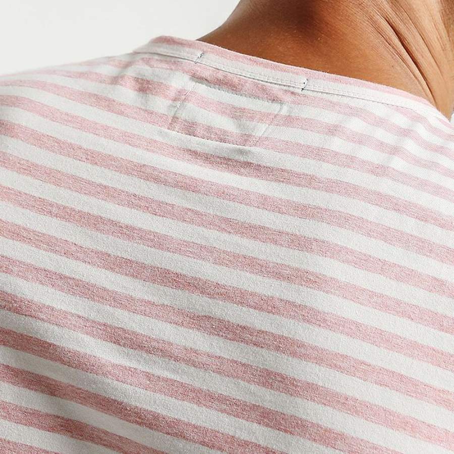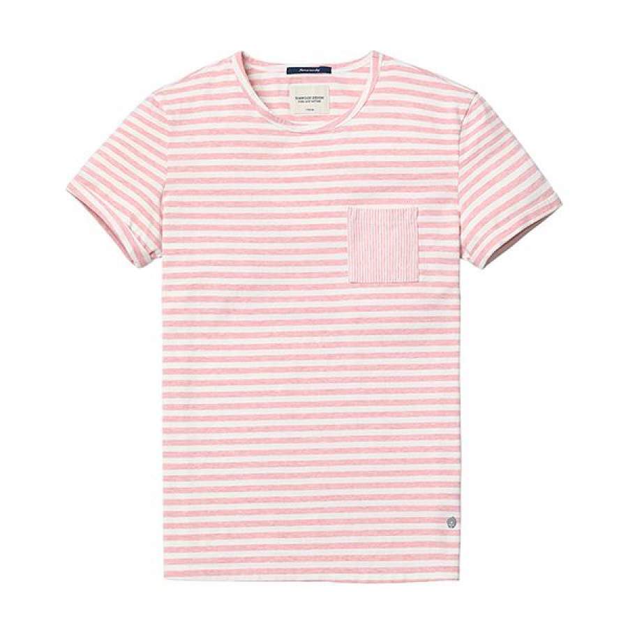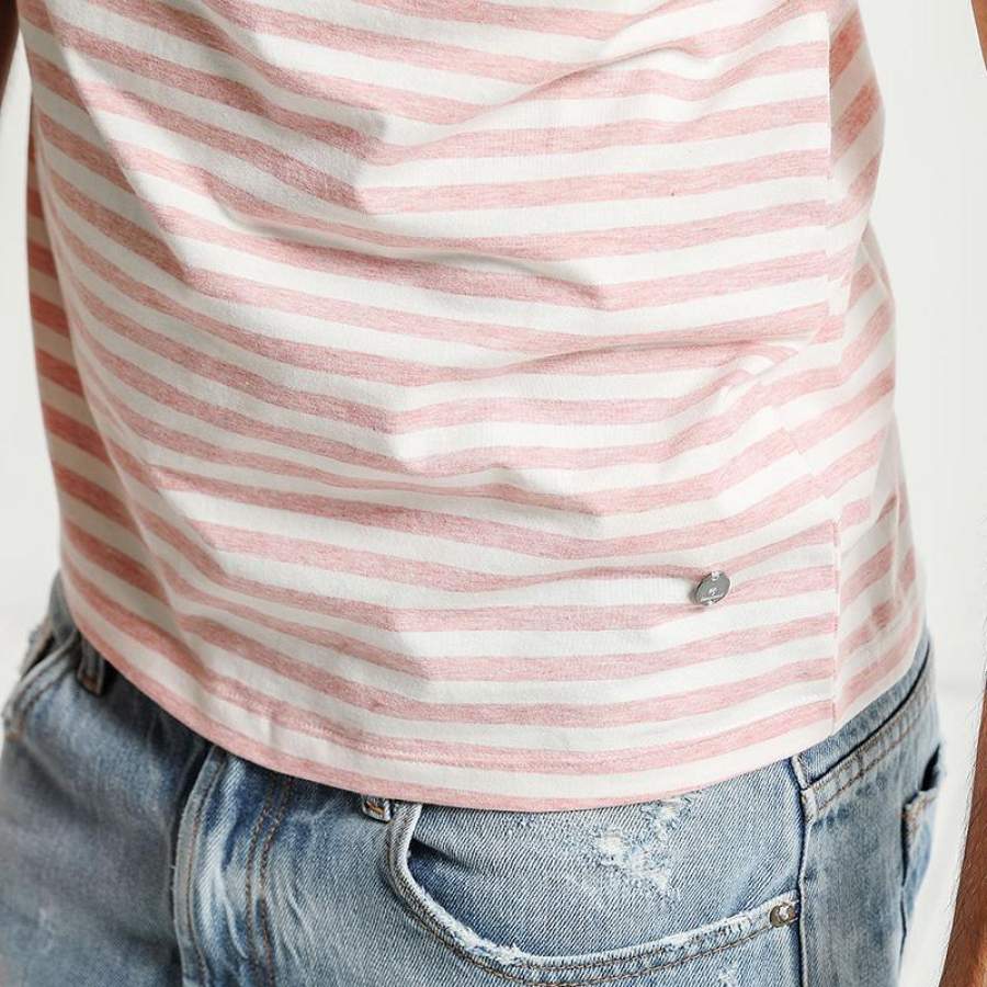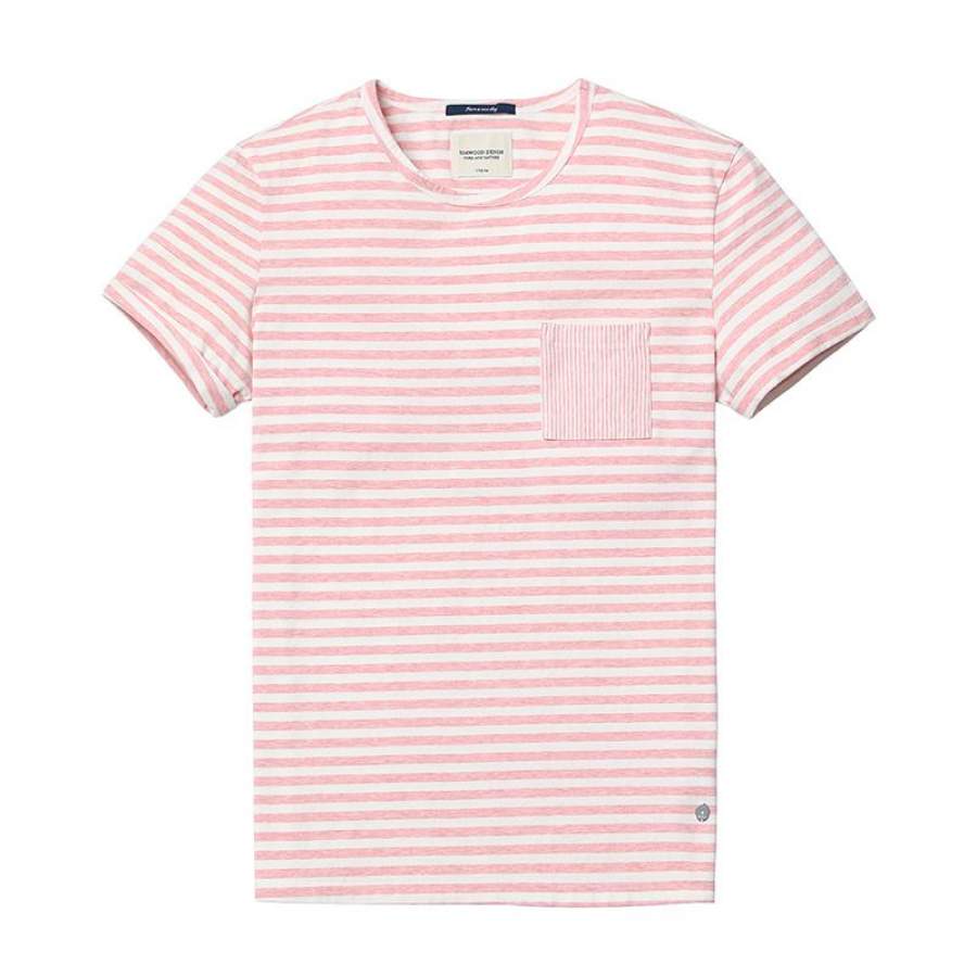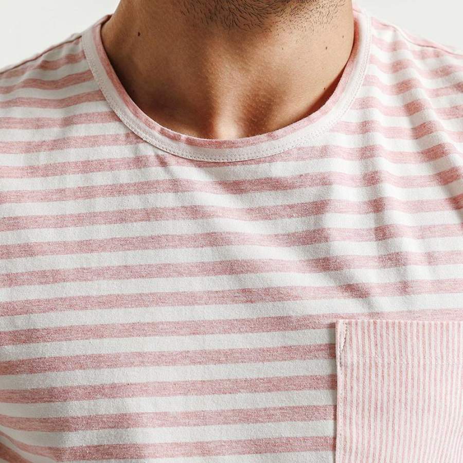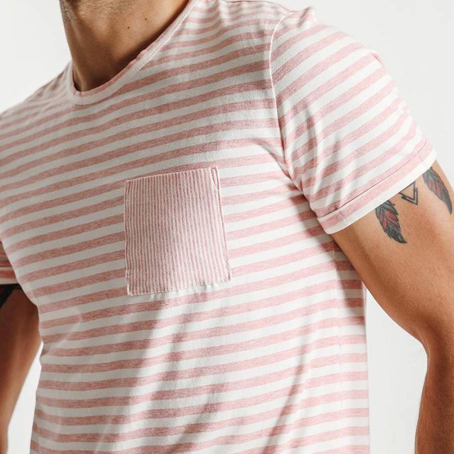 Summer New T Shirt Men Cotton Striped Slim Fit Clothing Pocket Pink Breton Top O neck