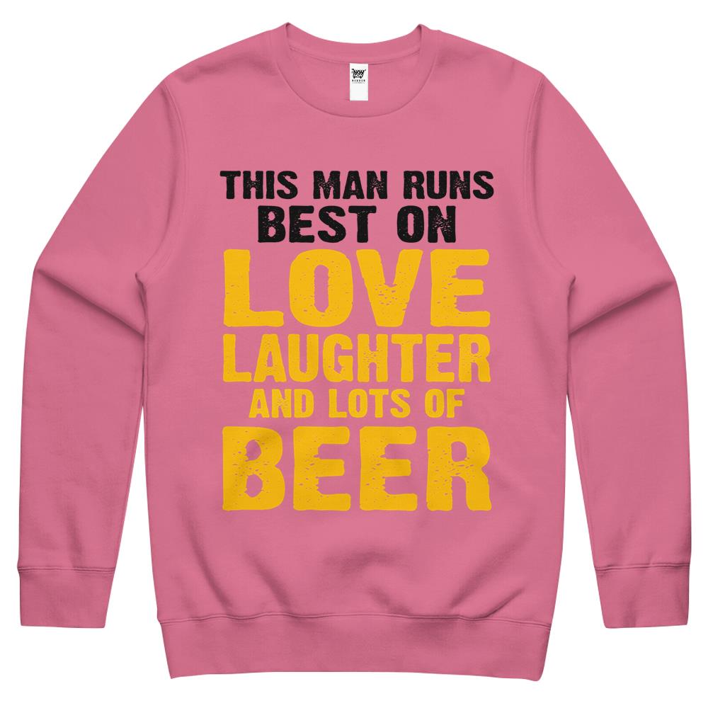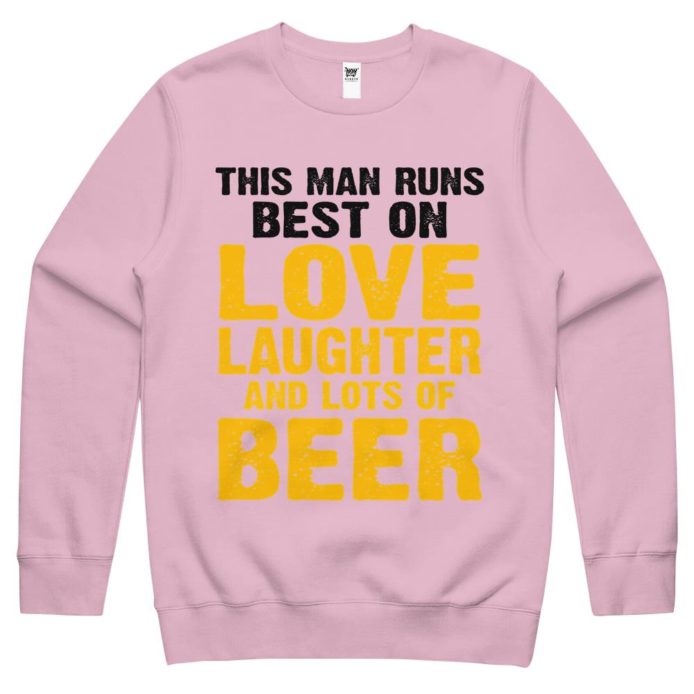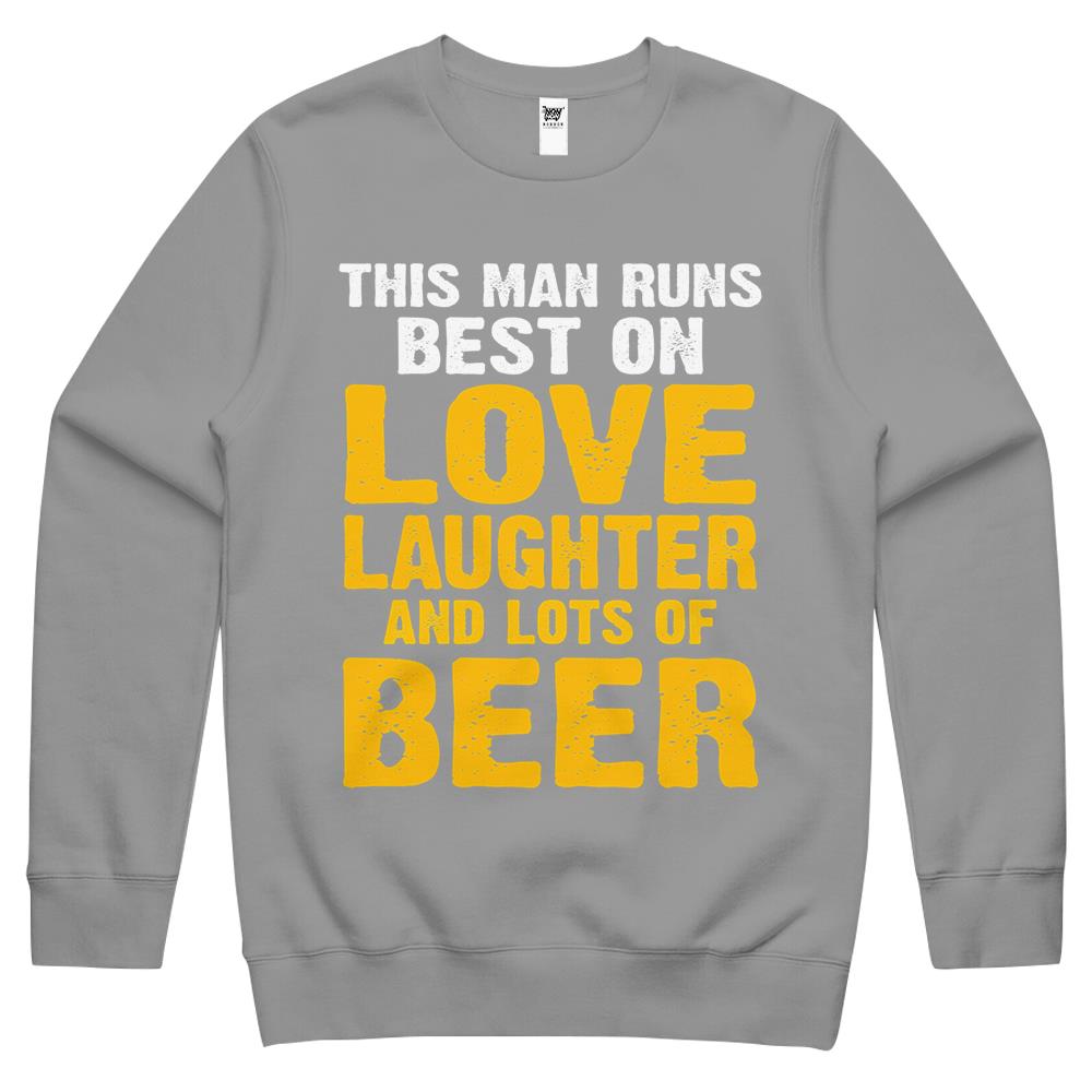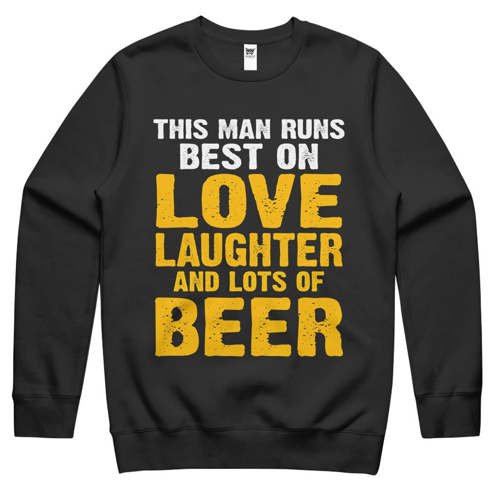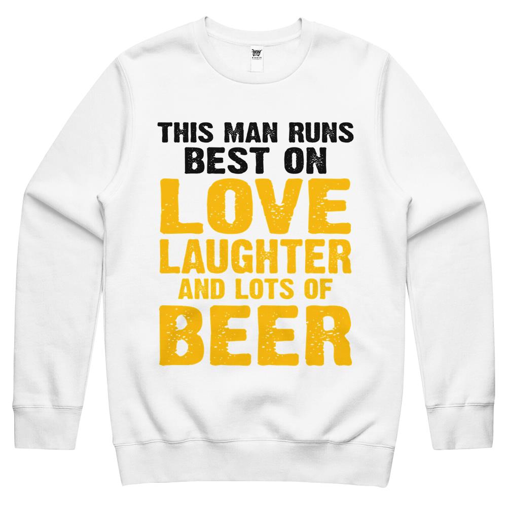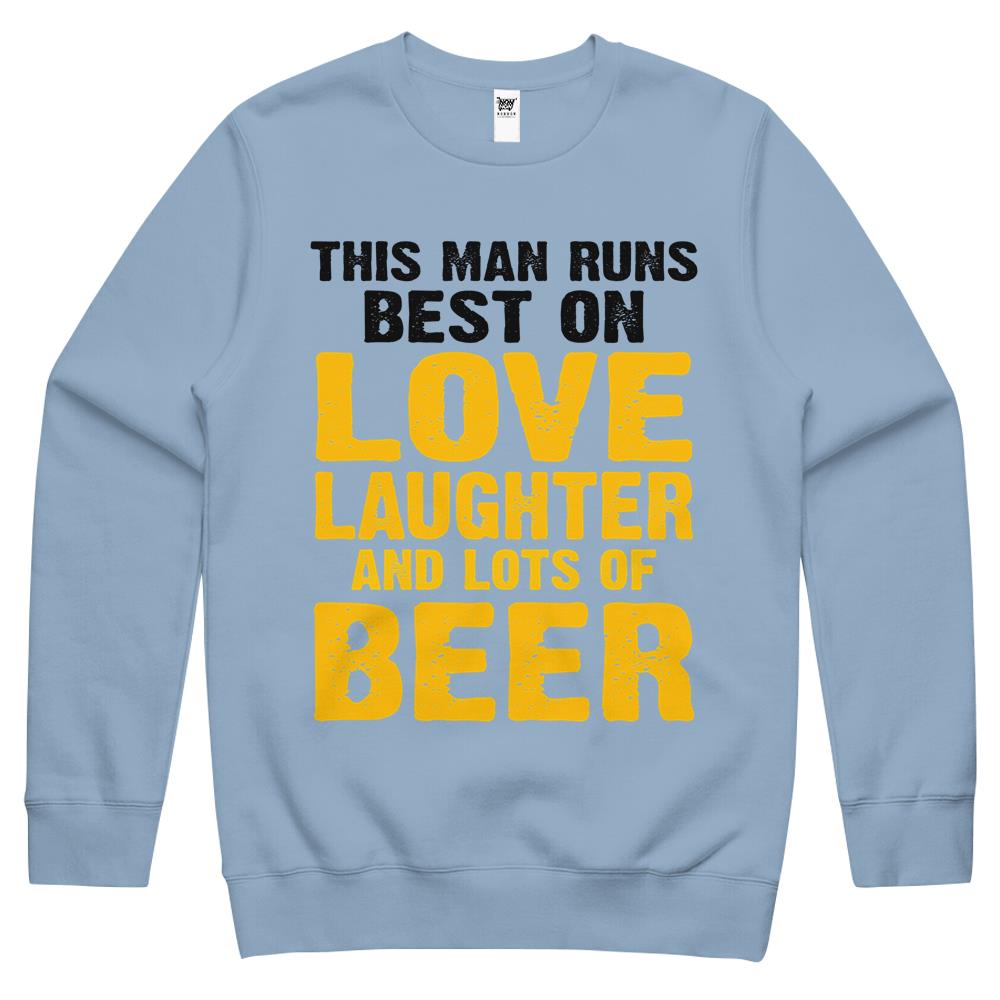 This Man Runs Best On Love Laughter And Lots Of Beer Drinker Crewneck Sweatshirt