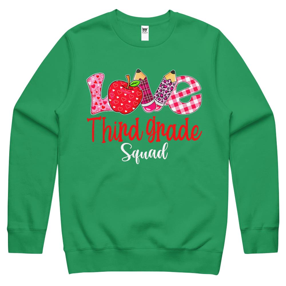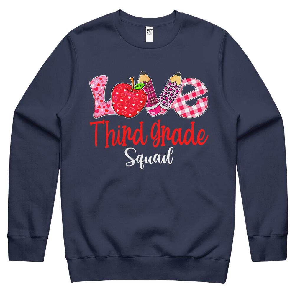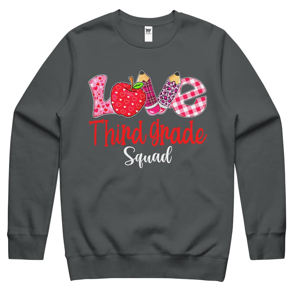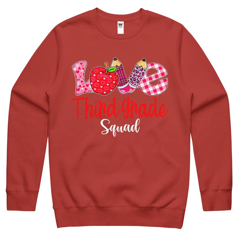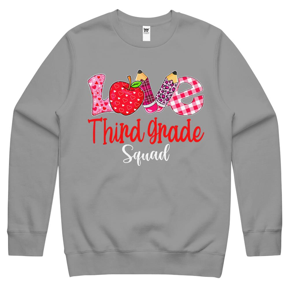 So whether you're looking to show off your own name or create a personalized gift for someone special, LateAndLow Store has got you covered. Start designing your own custom Valentines Day Love Third Grade Squad Teacher Kids Outfits Crewneck Sweatshirt print-on-demand product today, and let us bring your vision to life!