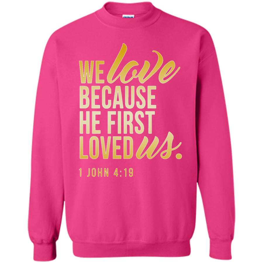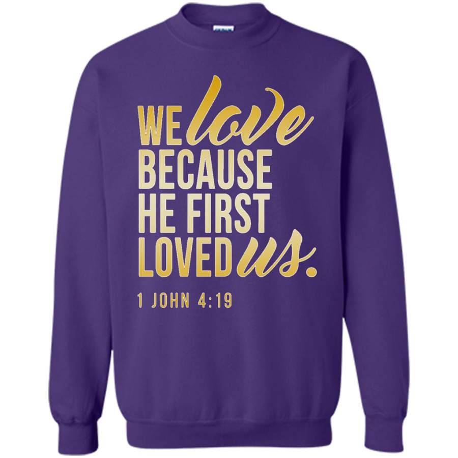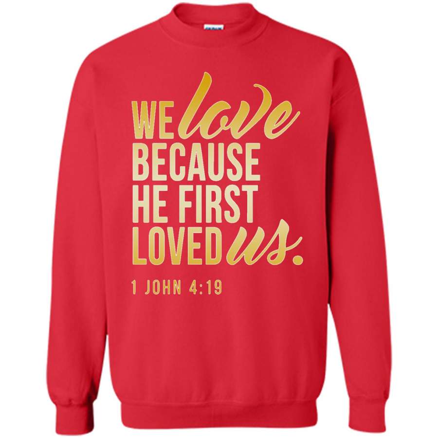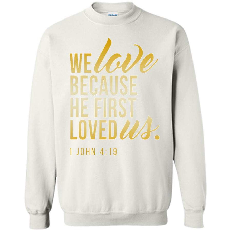 So whether you're looking to show off your own name or create a personalized gift for someone special, LateAndLow Store has got you covered. Start designing your own custom We Love Because He First Loved Us w – Gildan Crewneck Sweatshirt print-on-demand product today, and let us bring your vision to life!
