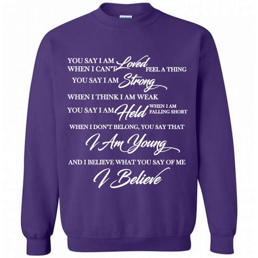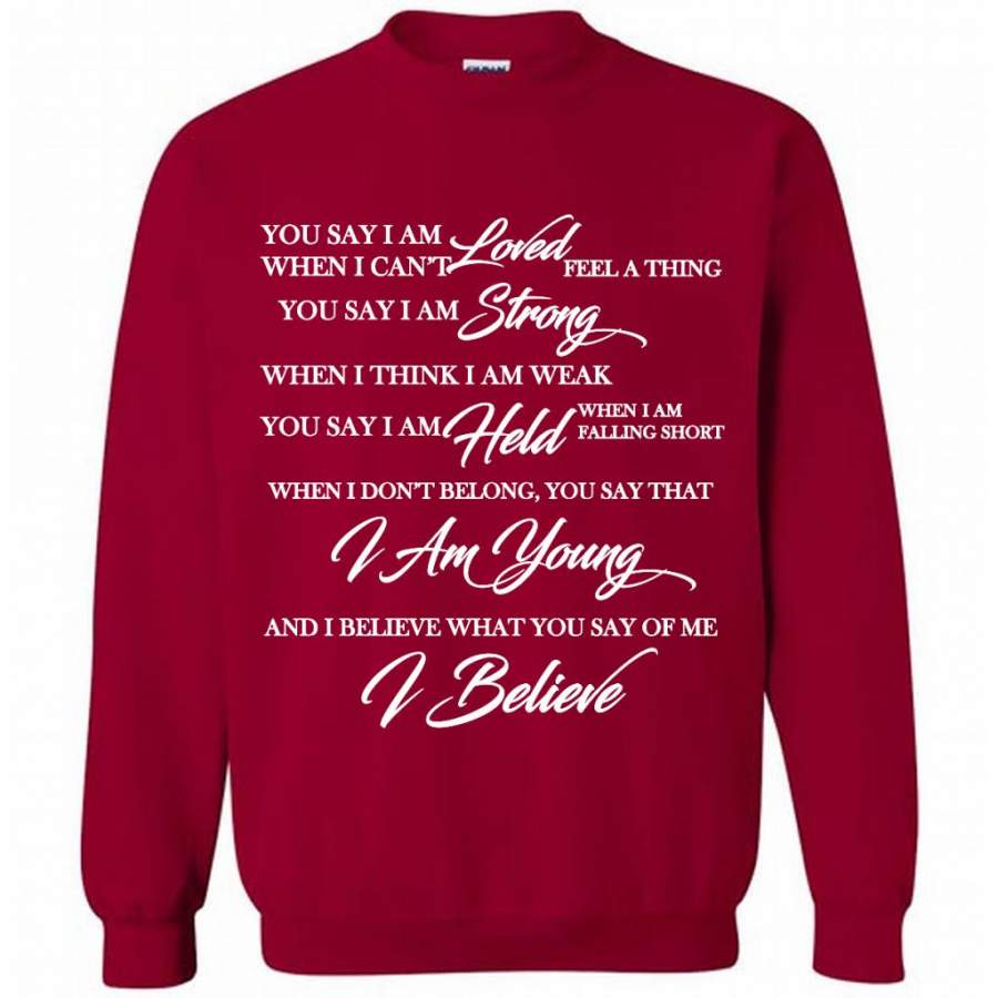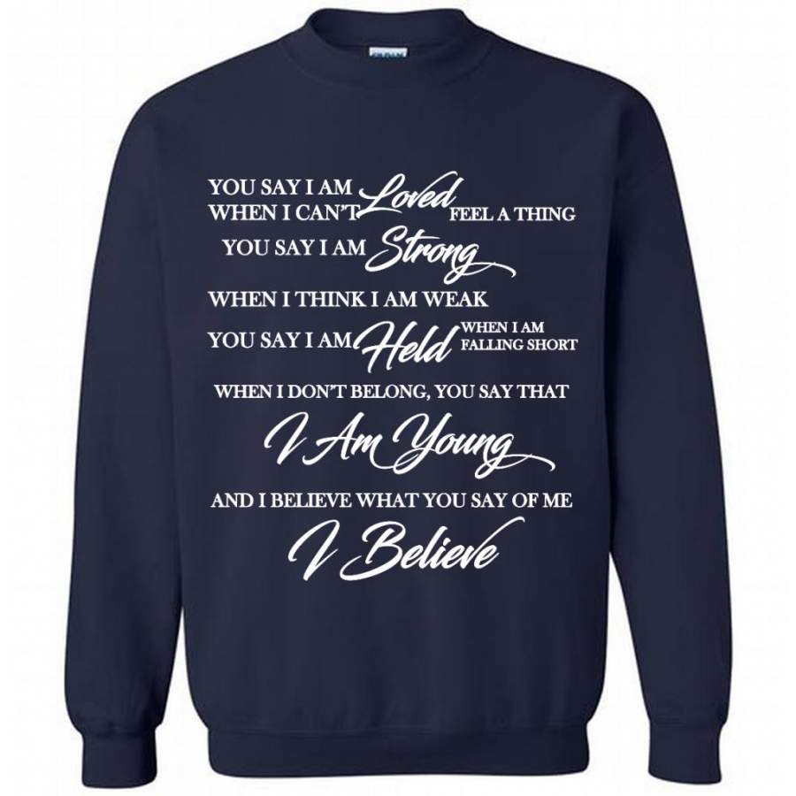 You Say I Am Loved When I Can’t Feel A Thing You Say I Am Strong When I Think I Am Weak You Say I Am Held When I Am Falling Short – Gildan Crewneck Sweatshirt
